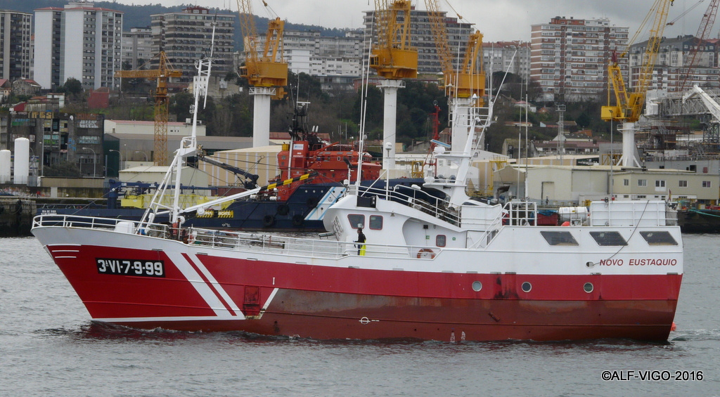 Fotografias del pesquero Novo Eustaquio, maniobrando en demanda de atraque para carga de hielo y preparación de pertrechos, para salida al caladero, donde faena. Forma parte de la flota de palangreros de La Guardia.