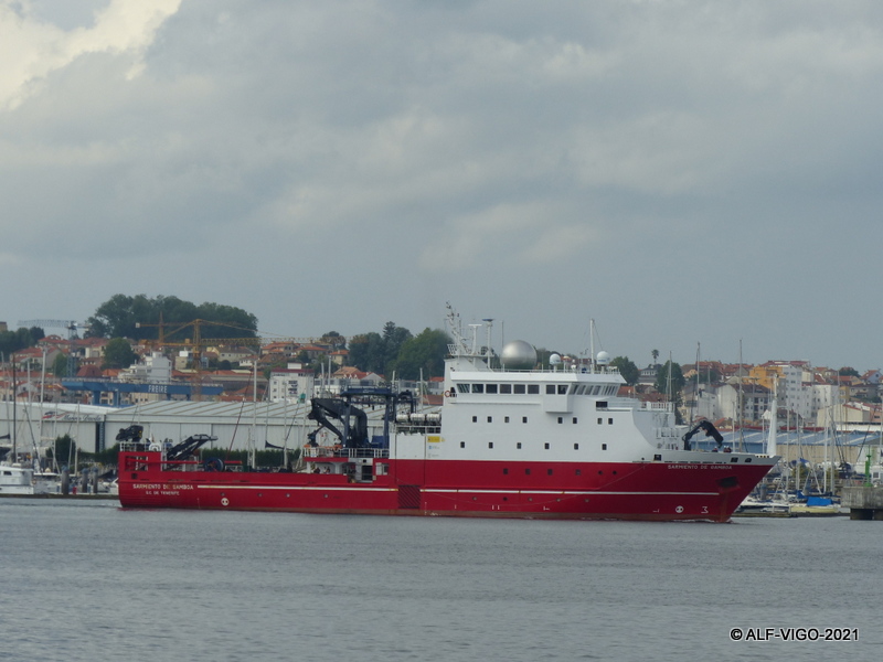 Fotografías de buque oceanográfico, "Sarmiento de Gamboa", saliendo de la dársena de Orillamar en el Berbes, par realizar pruebas de sistemas y equipos de comunicaciones, una vez realizadas de revisiones de mantenimiento.
